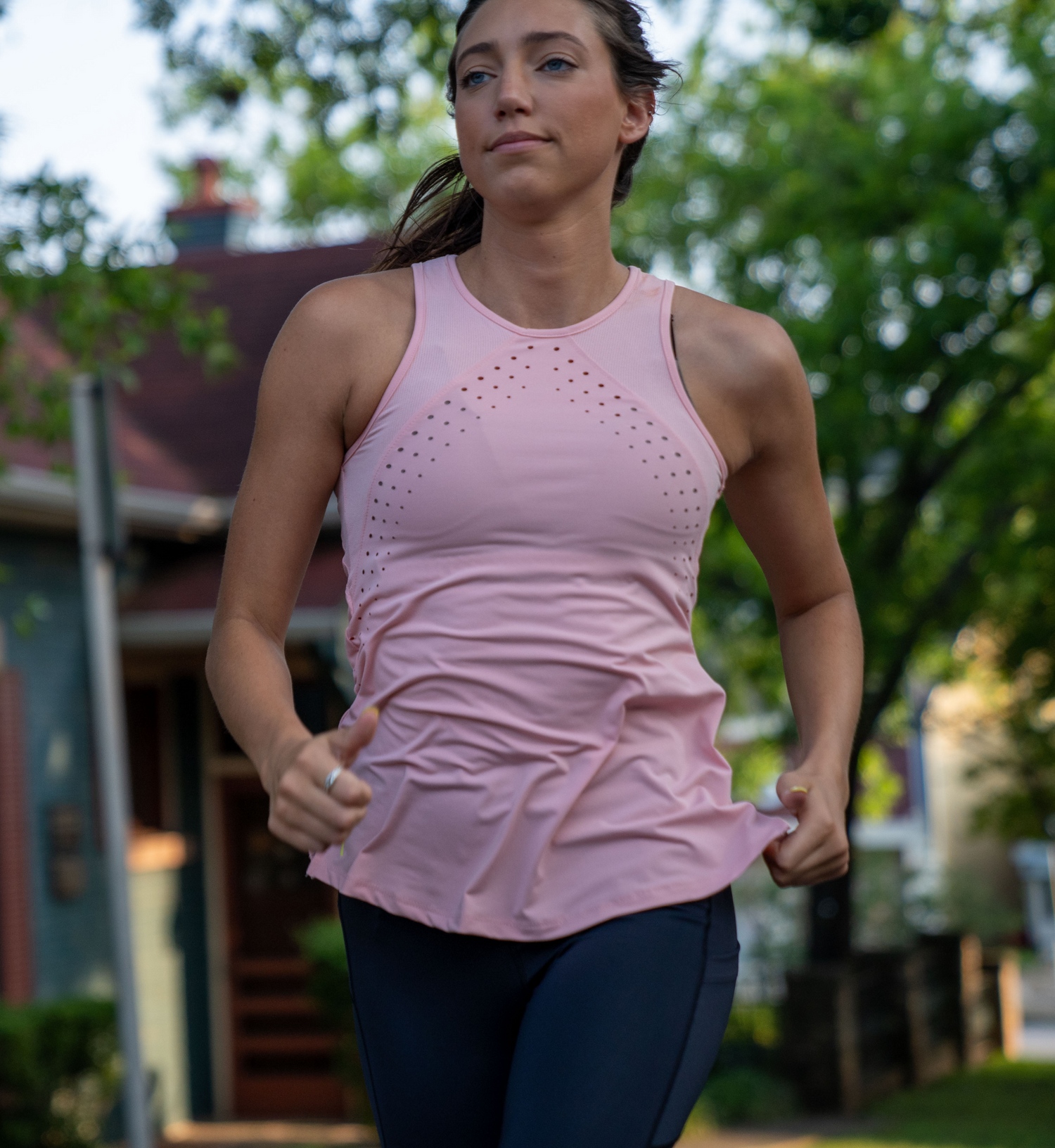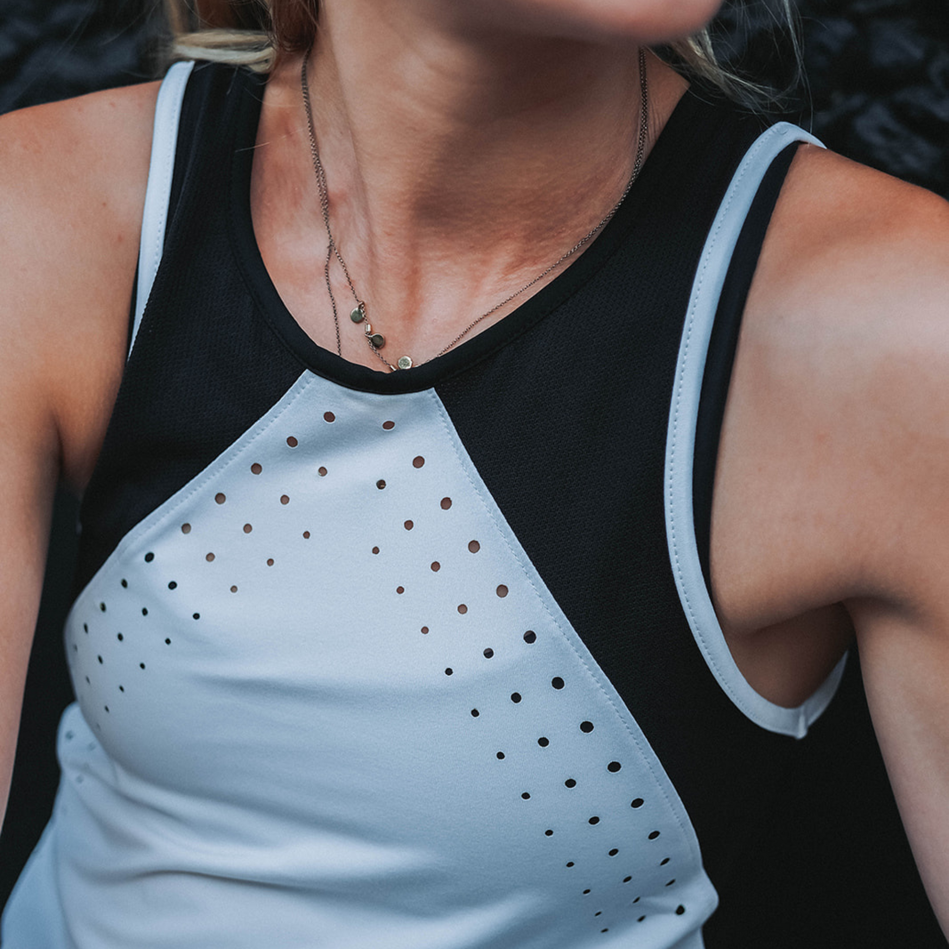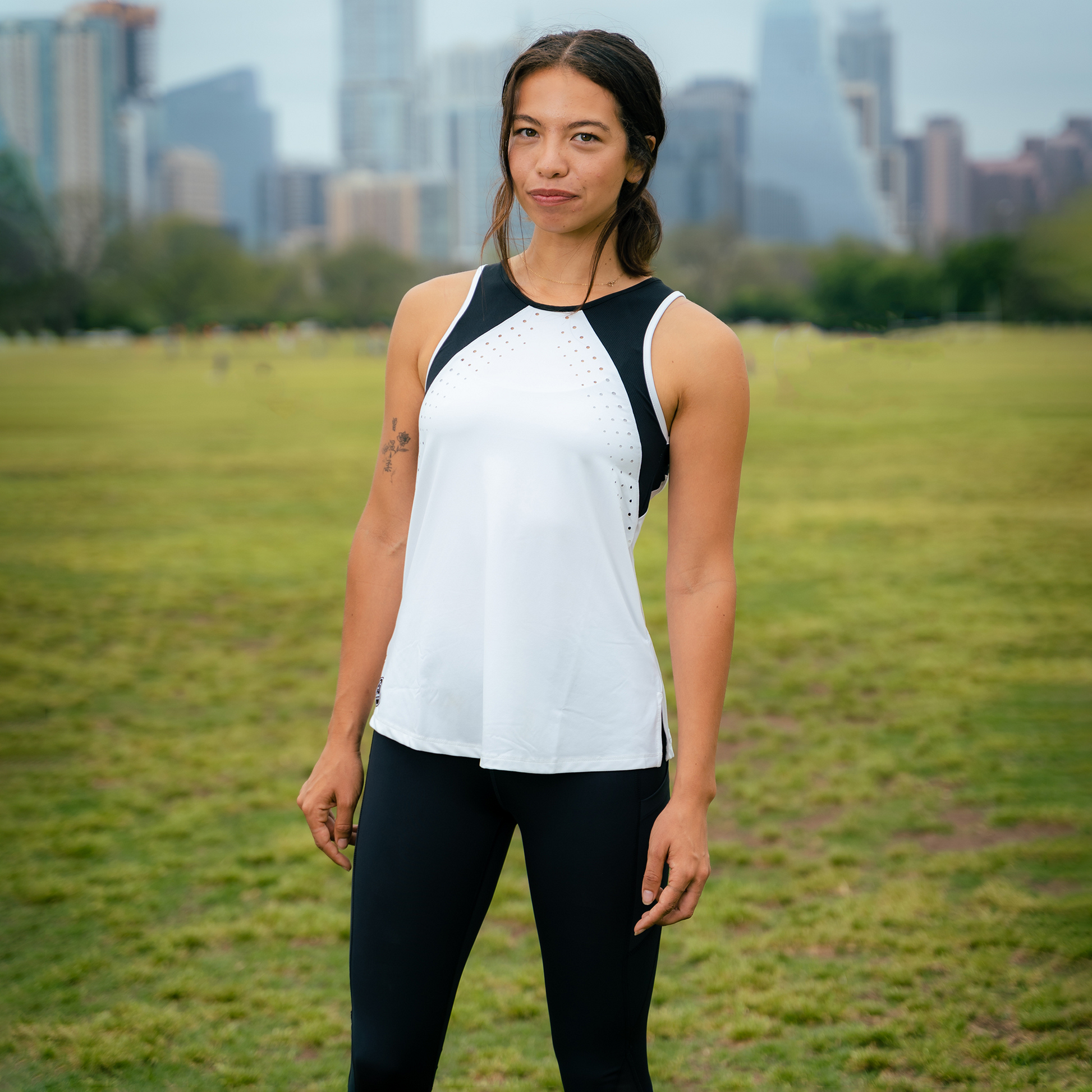 Designed to endure intense workouts out in the Texas heat, this tank features mesh inserts along the shoulders and armholes for enhanced ventilation. Perforations ascend along the neckline and side seam down through the back to give it a free-flowing feel.